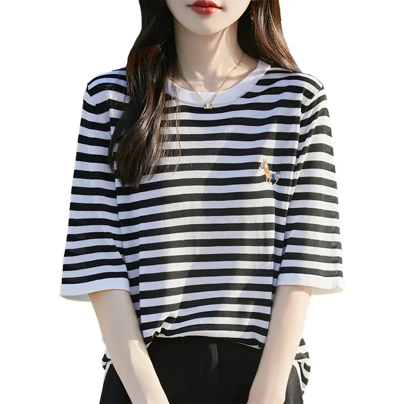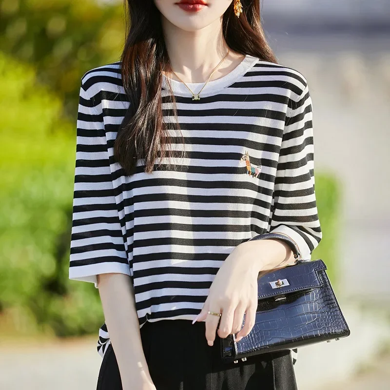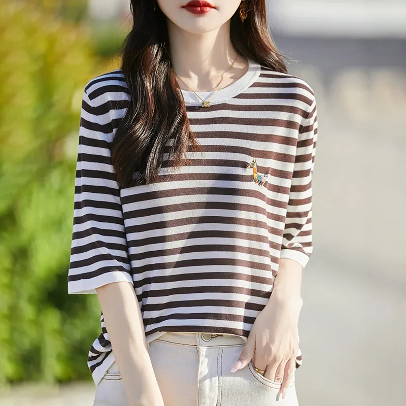 Summer New round Neck Striped Knitwear Short Sleeve Embroidered Tencel Lyocell Rainbow Horse Stitch Women’s Crew Neck Top