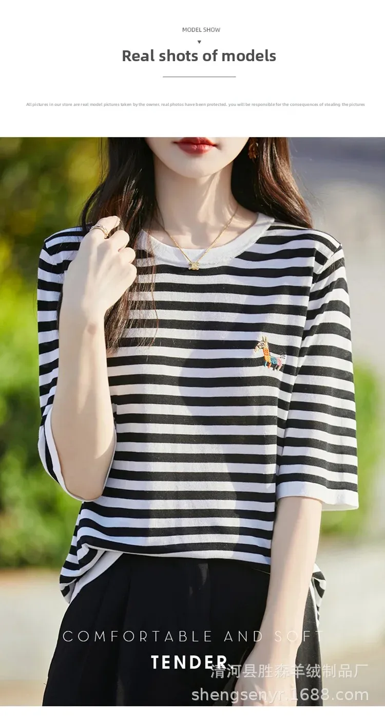 Be the first to review “Summer New round Neck Striped Knitwear Short Sleeve Embroidered Tencel Lyocell Rainbow Horse Stitch Women’s Crew Neck Top”